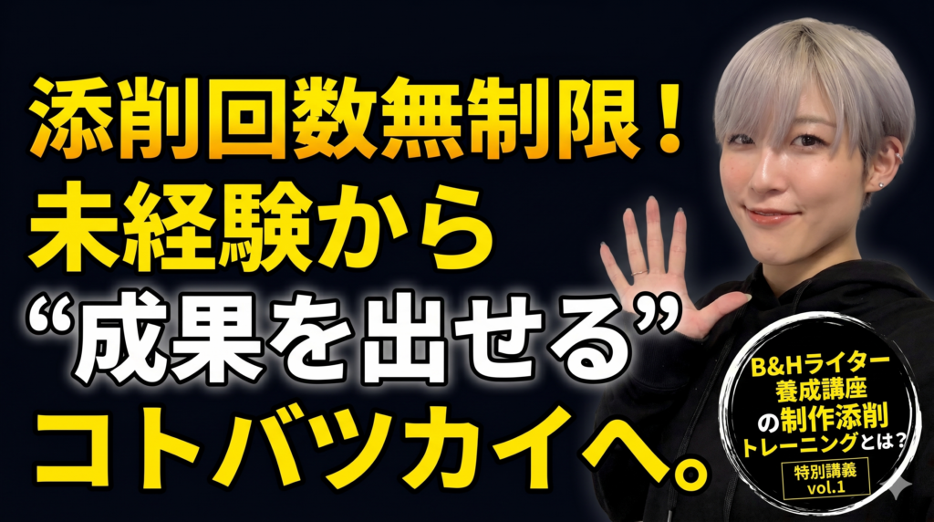 こんにちは!B&Hライター養成講座 主宰の中道麻智子です。今回の記事は、受講生であるひなたさんに書いていただきました! 壁打ちミーティングはB&Hライター養成講座のコンテンツの一つで、実際の案件の相談・添削やシゴト獲得の悩みを解決できる... -