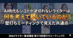 壁打ちミーティングでは、実際の相談を通して、シゴトにつながる考え方も学ぶことができます。知識として学ぶだけでは見えにくい、「シゴトが増える人の思考」を知れることが大きな価値です。スキルを学んで終わりではなく、「どう活かすか」まで学べることが、B&Hライター養成講座の魅力の一つです。